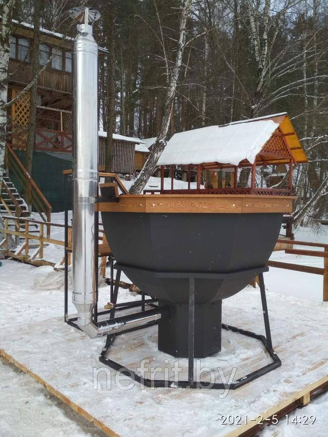 Чаша из нержавеющей стали aisi 304/ aisi 430 Дно 3мм Стенки -2,0мм Снаружи чаша покрыта жаростойкой эмалью. Внутри чаша – сатинирована Швы обработаны, зачищены Габариты – 1900 мм Высота чаши – 1000 мм Объем воды – 800-1000 л Вместимость - 6 человек