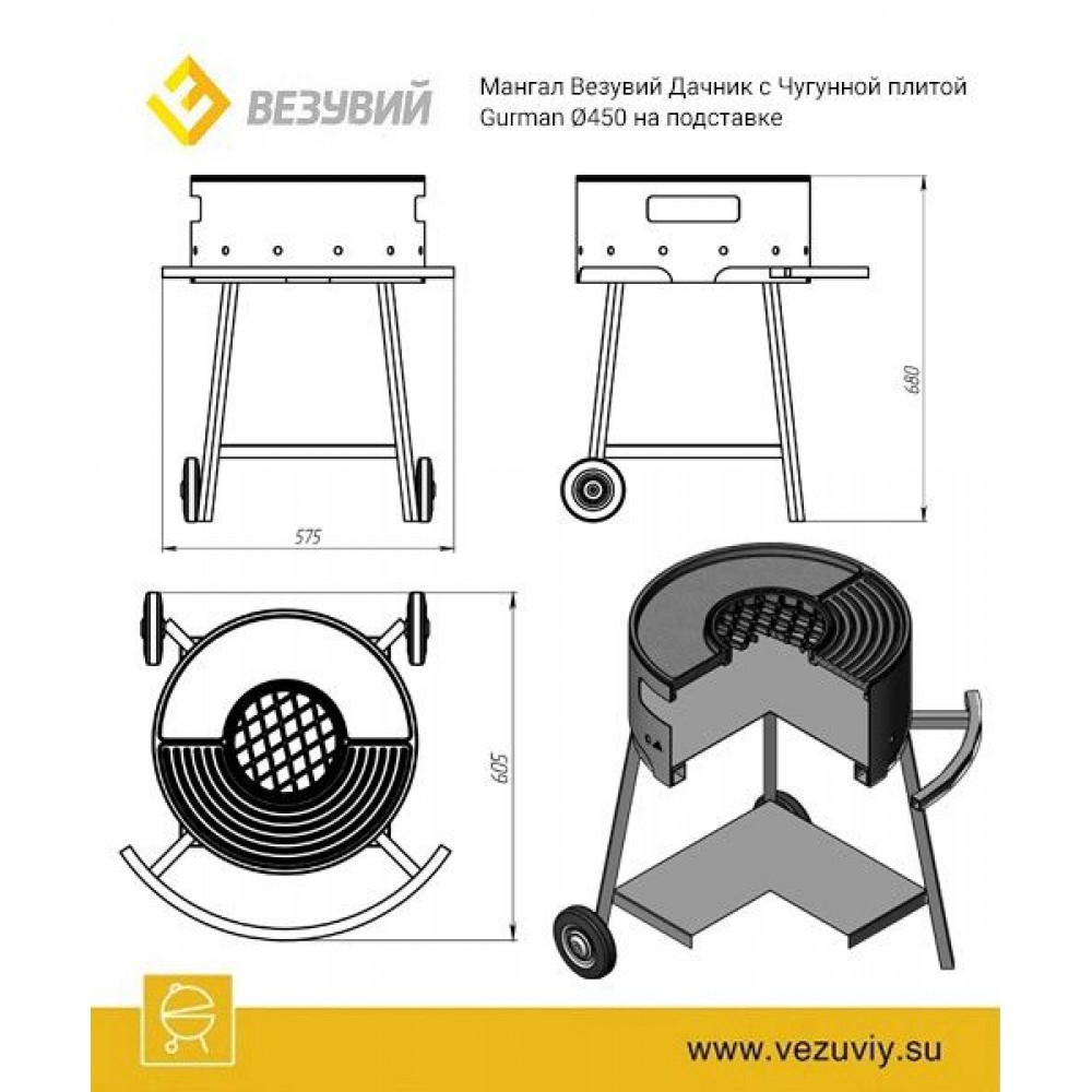 Мангал Дачник, изготовленный из конструкционной стали толщиной 2 мм, имеет круглую форму. Он предназначен для совместного использования чугунной плитой Везувий Gurman диаметром 45 сантиметров.