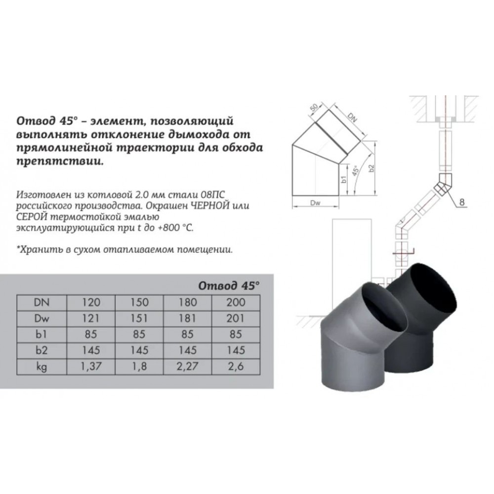 Отвод 45° – элемент, позволяющий выполнять отклонение дымохода от прямолинейной траектории для обхода препятствии.