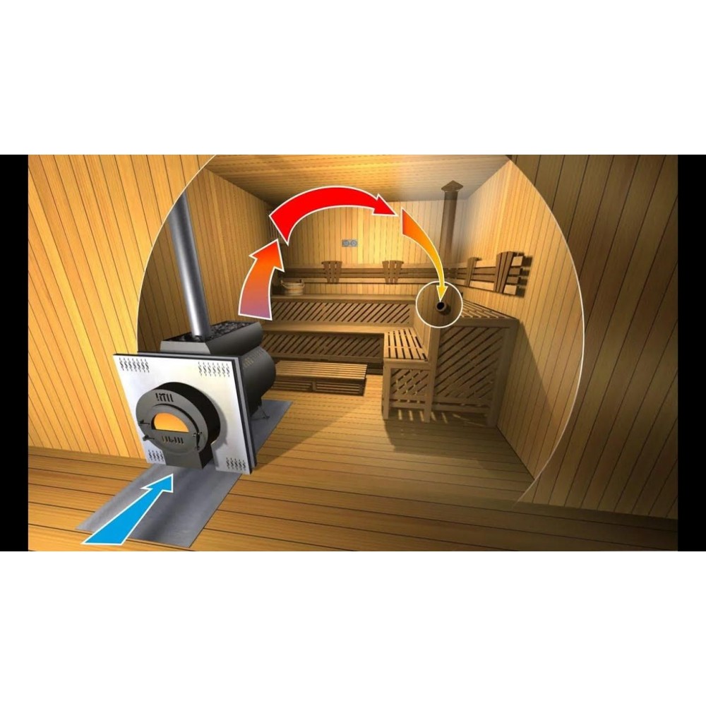 Благодаря такому устройству теплые газовые массы скапливаются под перекрытиями сауны. Внешне это похоже на перевернутый и закрытый со всех сторон купол.