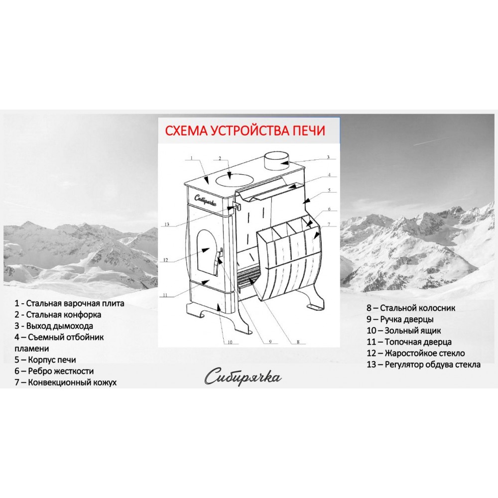 Воздухогрейная печь «Сибирячка» представляет собой отопительный прибор, предназначенный для обогрева помещений различного назначения объемом от 100 м3 до 200 м3. Отличительной особенностью данной печи является наличие в ее конструкции варочной плиты, предназначенной для приготовления пищи и нагрева воды. Стенки печи изготовлены из стали марки Ст.3 СП 5 толщиной 3 мм, а варочная плита – 6 мм, которая с обратной стороны имеет кольцо, необходимое для удержания металлического кружка. Неповторимая эстетика печи «Сибирячка» достигается за счет создания стильного дизайна, позволяющего дополнить любой загородный интерьер качественным отопительным прибором по более чем доступной цене. Основным источником топлива в данной печи являются дрова и прессованные древесные брикеты, позволяющие получать максимальное тепло при использовании данной печи для отопления, а высокоточный лазерный раскрой металла в совокупности с робототизированной сваркой ключевых узлов печи делает эту печь еще надежней и долговечней. Данная модификация оснащена кожухом из окрашенной стали Ст.3 СП 5, толщина которого составляет 1 мм.