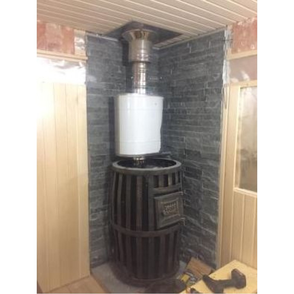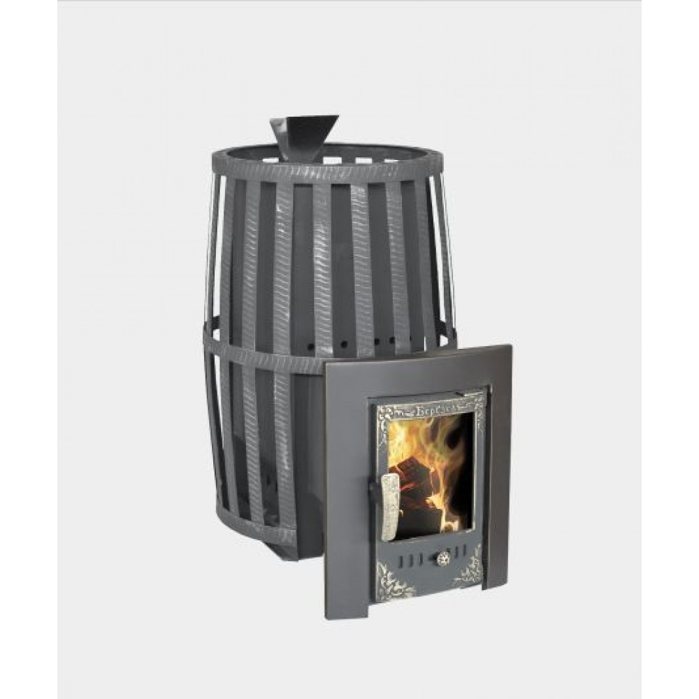 Банная печь накопительного типа, объединившая в себе две каменки - открытую и закрытую. Открытая каменка, как у большинства классических печей, прогревается от газоходных каналов и нагревает камень до температуры 250-300С. Закрытая каменка прогревает камень значительно сильнее - до температуры 400-450С. Также закрытая каменка имеет дозатор для равномерной подачи воды по всей длине каменки и лейку с клапаном для удобной подачи воды непосредственно в закрытую каменку. По желанию, поддавать в закрытую каменку можно через дверку, расположенную сзади корпуса печи. Подача воды в закрытую каменку через систему дозатора более эффективна, так как в этом случае происходит более сильный перегрев пара, он проходит через всю каменку и выходит через специальные отверстия, расположенные на противоположной стороне печи. Топка печи изготовлена из стали повышенной прочности марки 09Г2С (ГОСТ 19281-2014) толщиной 6-8 мм, которая значительно увеличивает срок службы печи.