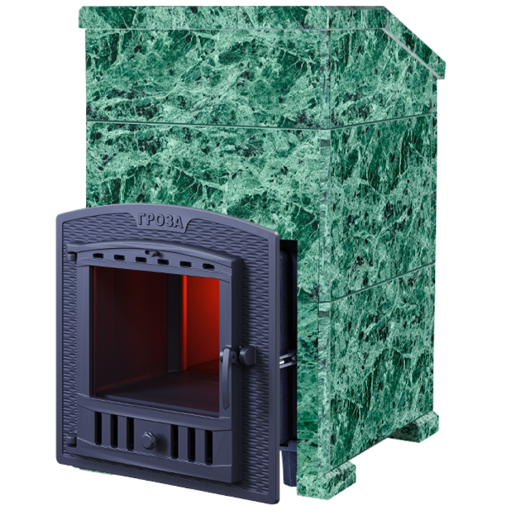 Чугунные банные печи ТМ «Гроза» — это современные печи, рассчитанные на малые и средние размеры парных. Печь имеет прочную сборную конструкцию, без резьбовых и сварных соединений, детали выполнены из легированного чугуна. Топка печей «Гроза» состоит из двух камер, разделенных пламегасителем. Радиаторные выступы каменки, направленные вглубь топки, увеличивают площадь контакта огня с каменкой и эффективность теплосъема. Для увеличения площади поверхности нагрева камней каменка снаружи оборудована чугунными шипами, направленными вверх. Между шипами укладываются банные камни или дополнительные чугунные заклады, такие как ядра и чугунные шишки. Сами чугунные шипы также являются частью заряда для лучшего испарения воды.