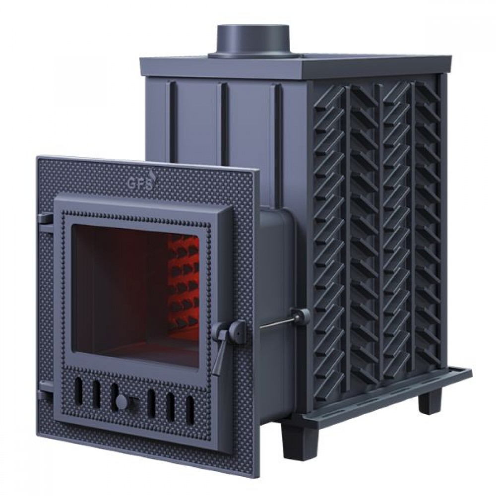 GFS-ЗК - печь с усиленной каменкой большей массы, с единым углублением внутрь топки для дополнительной укладки чугунного заряда. Теплосъемные шипы, со стороны горения пламени, в разы увеличивают площадь соприкосновения огня с каменкой и ускоряют передачу тепла, а также способствуют лучшему дожигу смешивая потоки пламени и воздуха поступаемого из воздушника. Эти усовершенствования значительно повышают мощность парообразования печи и выдают большее количество пара при непрерывной подаче воды. Каменка печей GFS-ЗК является незаливаемой.