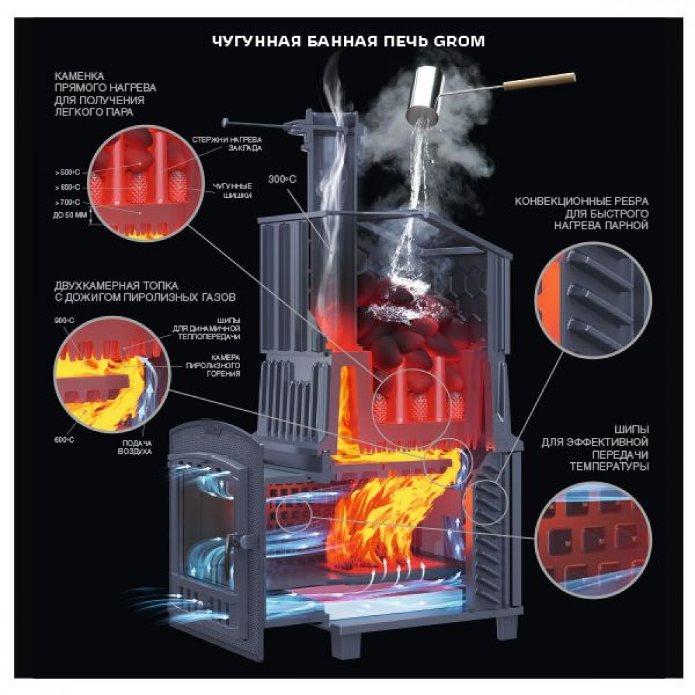 Печи линейки «Гром» имеют в комплекте чугунный короб для установки на каменку и чугунную стартовую трубу длиной 500 мм. Увеличенная масса, толщина боковых стенок 14 мм повышают надежность и теплоаккумулирующую способность, а для быстрого нагрева парной боковые стенки оборудованы конвекционными ребрами не только снаружи, но и на внутренней поверхности.