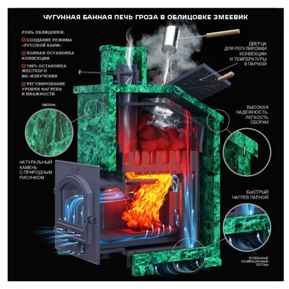 Печь Гефест Гроза с уникальной каменкой прямого нагрева для получения легкого мелкодисперсного пара, необходимого для режима русской бани. Благодаря инновационной конструкции, печь гарантированно входит в режим за 60 минут.