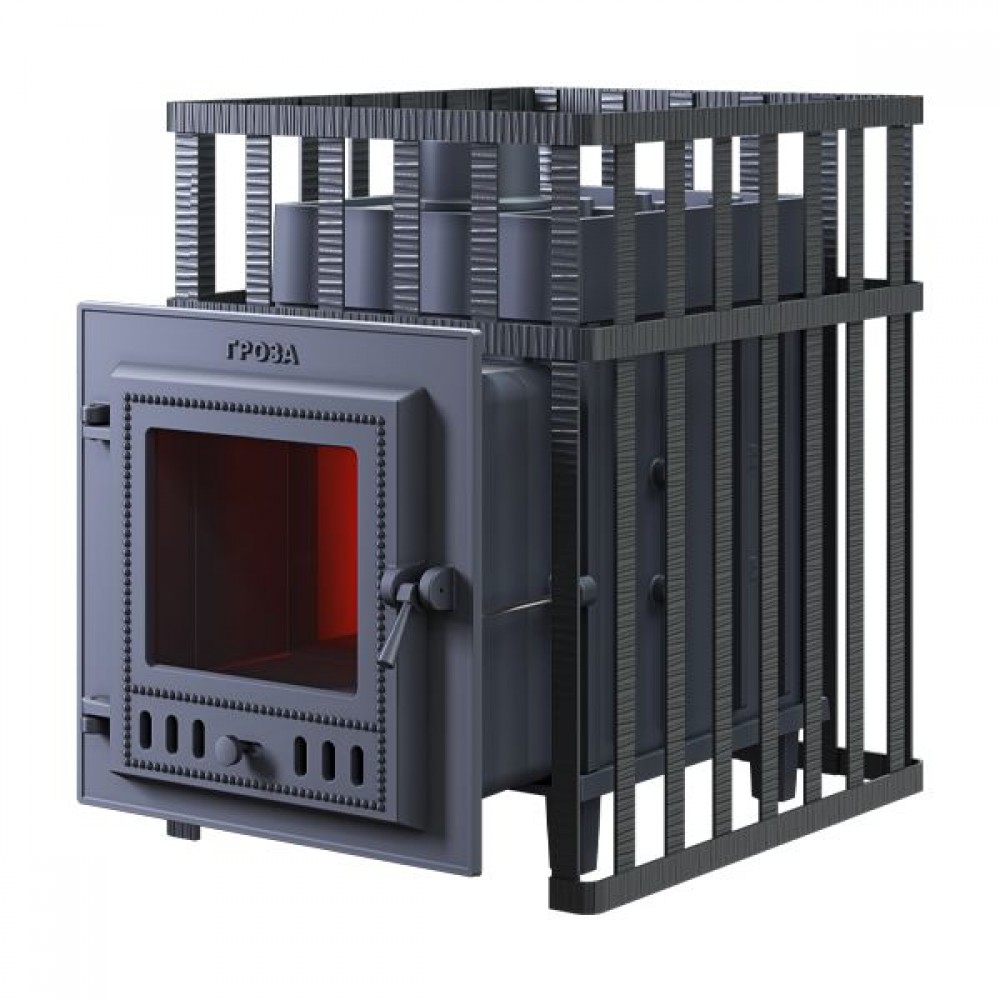 Печь Гроза 18 (М) в Сетке из чугуна создаст подходящий климат для вашей бани. Чугунные банные печи ТМ «Гроза» — это современные печи, рассчитанные на малые и средние размеры парных. Печь имеет прочную сборную конструкцию, без резьбовых и сварных соединений, детали выполнены из легированного чугуна. Топка печей «Гроза» состоит из двух камер, разделенных пламегасителем. Радиаторные выступы каменки, направленные вглубь топки, увеличивают площадь контакта огня с каменкой и эффективность теплосъема. Для увеличения площади поверхности нагрева камней каменка снаружи оборудована чугунными шипами, направленными вверх. Между шипами укладываются банные камни или дополнительные чугунные заклады, такие как ядра и чугунные шишки. Сами чугунные шипы также являются частью заряда для лучшего испарения воды.