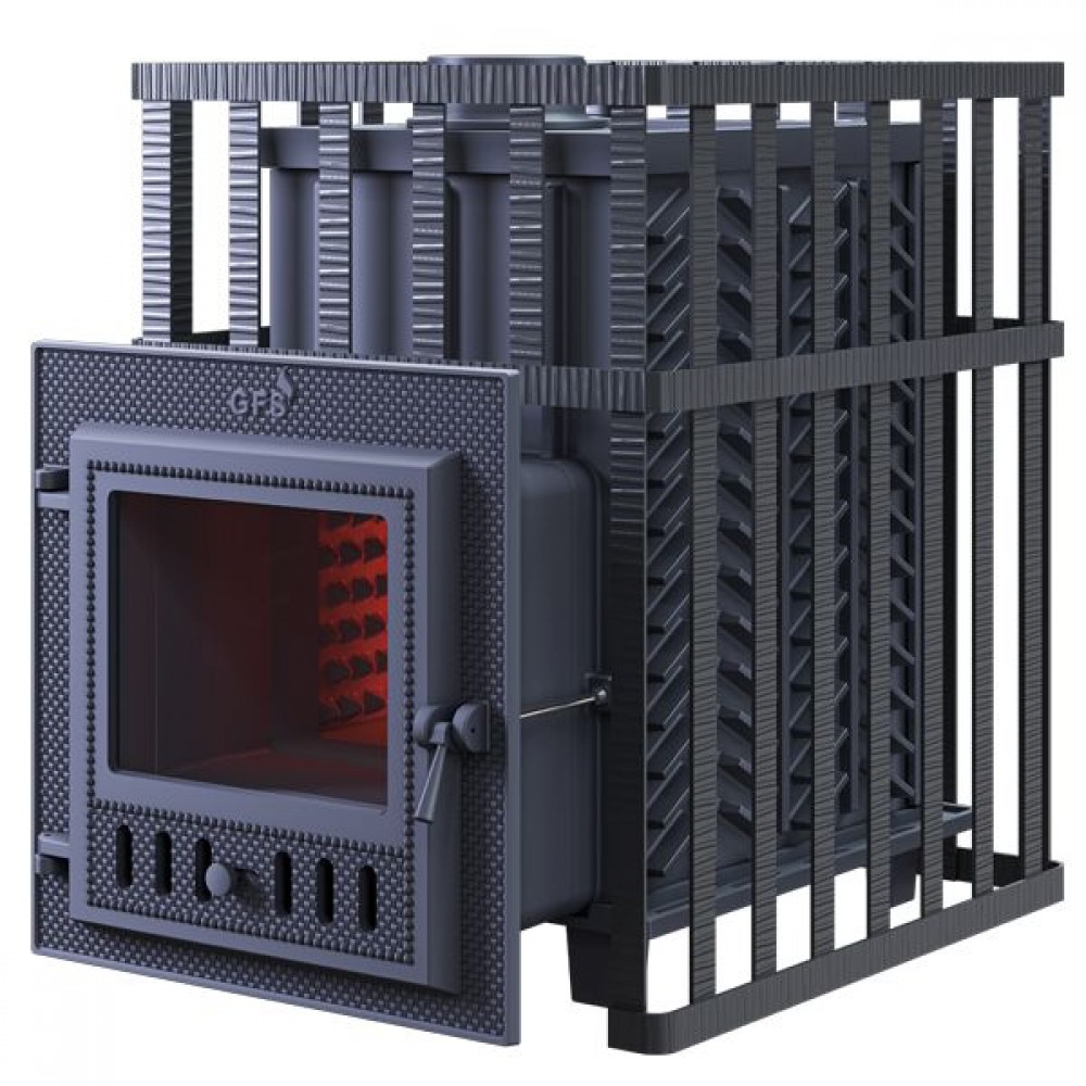 GFS-ЗК - печь с усиленной каменкой большей массы, с единым углублением внутрь топки для дополнительной укладки чугунного заряда. Теплосъемные шипы, со стороны горения пламени, в разы увеличивают площадь соприкосновения огня с каменкой и ускоряют передачу тепла, а также способствуют лучшему дожигу смешивая потоки пламени и воздуха поступаемого из воздушника. Эти усовершенствования значительно повышают мощность парообразования печи и выдают большее количество пара при непрерывной подаче воды. Каменка печей GFS-ЗК является незаливаемой.