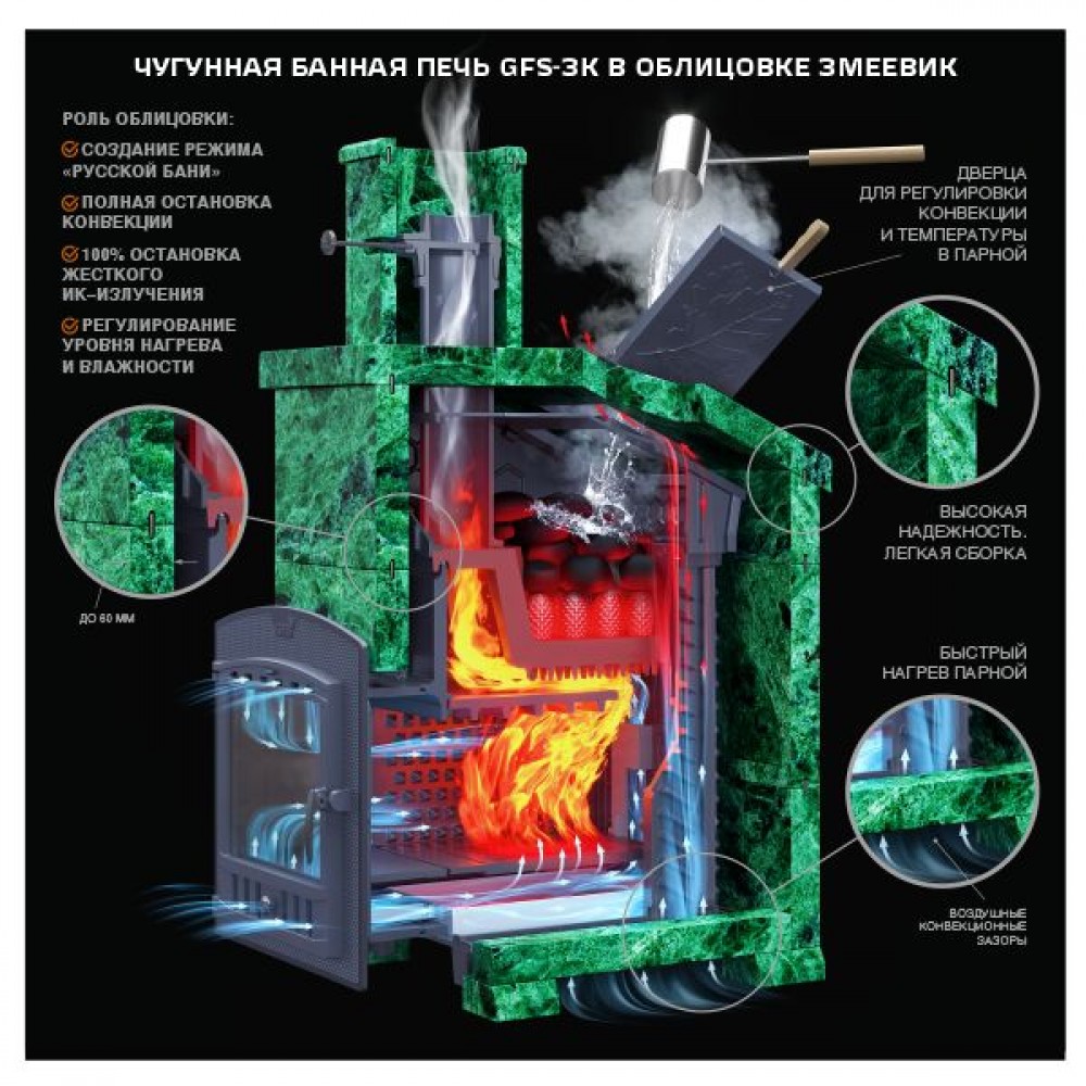 Печь GFS-3К с уникальной каменкой прямого нагрева для получения легкого мелкодисперсного пара, необходимого для режима русской бани. Благодаря инновационной конструкции, печь гарантированно входит в режим за 60 минут.