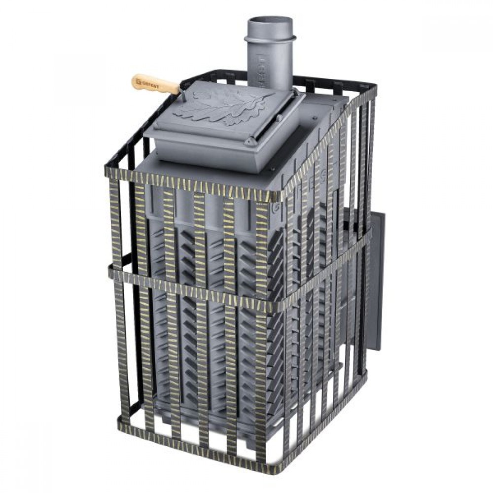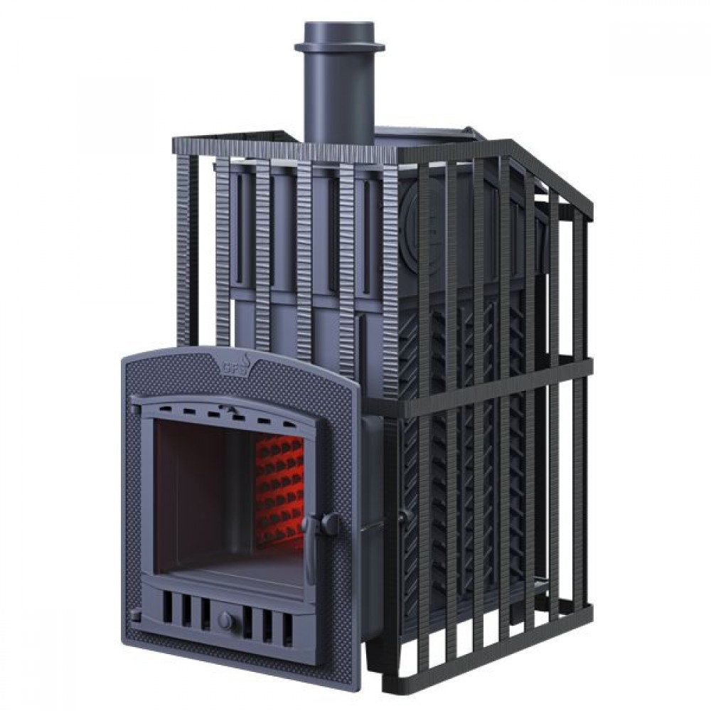 GFS-ЗК Ураган 25 (П)2 - расширенный комплект печи в сетке. Максимально приближенный вариант печи для режимов русской парной, имеющий непосредственно закрытую чугунным коробом каменку, дверцу для пара с ручкой из бука. Печь легко модернизируется до полноценной печи предназначенной для Русской бани путем замены стальной сетки на каменную облицовку без демонтажа дымохода.