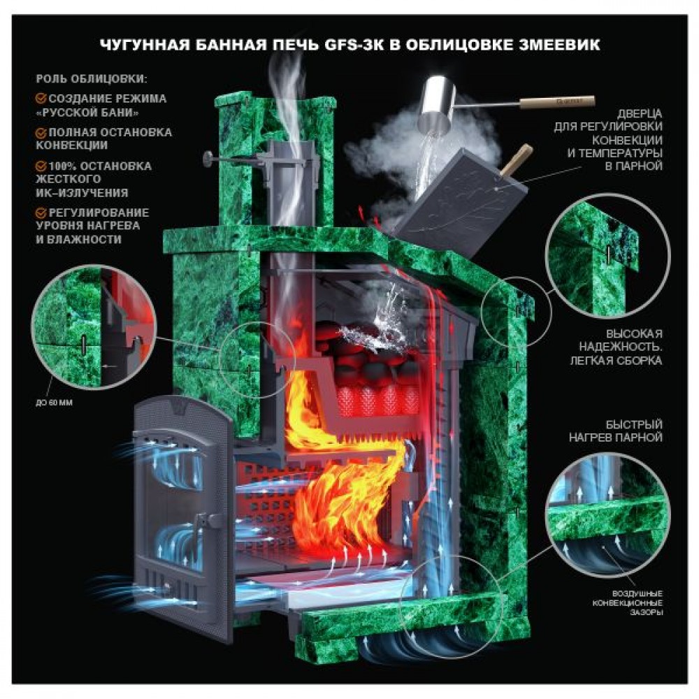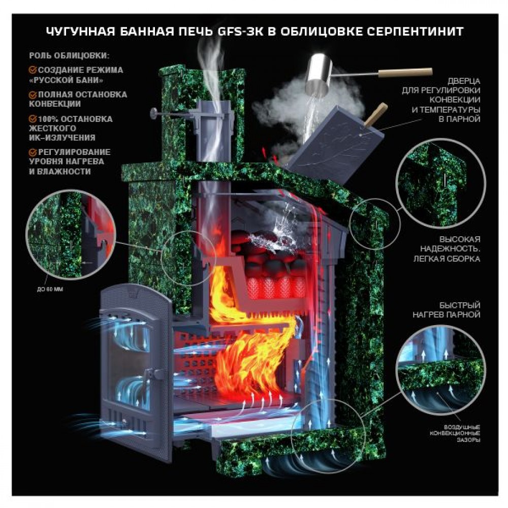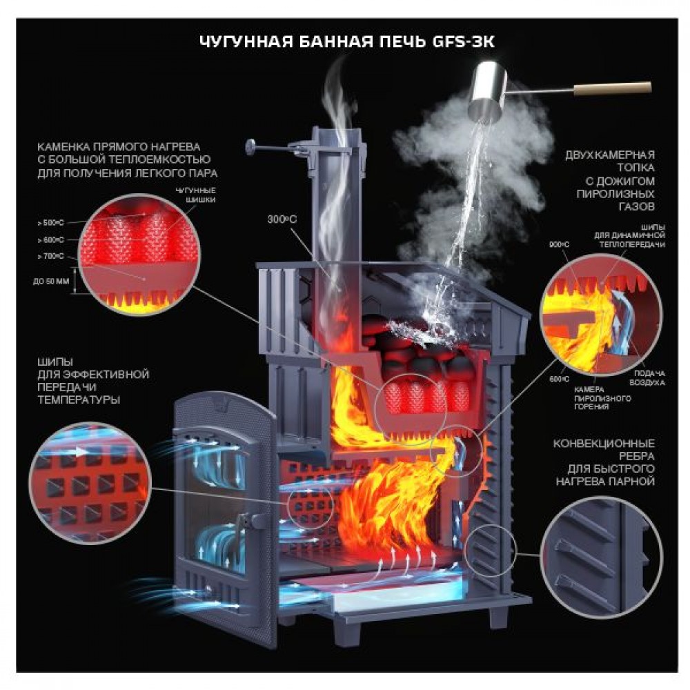 GFS-ЗК - печь с усиленной каменкой большей массы, с единым углублением внутрь топки для дополнительной укладки чугунного заряда. Теплосъемные шипы, со стороны горения пламени, в разы увеличивают площадь соприкосновения огня с каменкой и ускоряют передачу тепла, а также способствуют лучшему дожигу смешивая потоки пламени и воздуха поступаемого из воздушника. Эти усовершенствования значительно повышают мощность парообразования печи и выдают большее количество пара при непрерывной подаче воды. Каменка печей GFS-ЗК является незаливаемой.