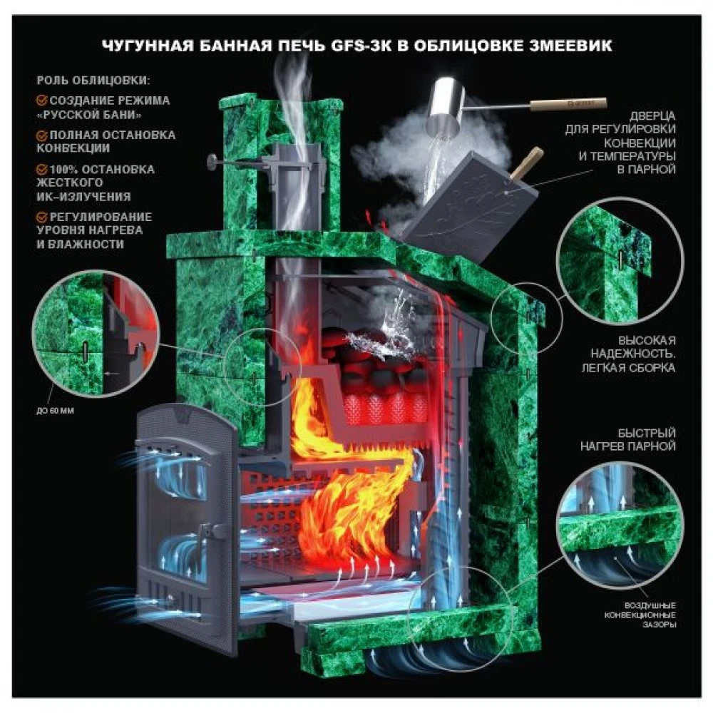 GFS-ЗК в сетке 45(М) - печь с усиленной каменкой большей массы, с единым углублением внутрь топки для дополнительной укладки чугунного заряда. Теплосъемные шипы, со стороны горения пламени, в разы увеличивают площадь соприкосновения огня с каменкой и ускоряют передачу тепла, а также способствуют лучшему дожигу смешивая потоки пламени и воздуха поступаемого из воздушника. Эти усовершенствования значительно повышают мощность парообразования печи и выдают большее количество пара при непрерывной подаче воды. Каменка печей GFS-ЗК является незаливаемой.