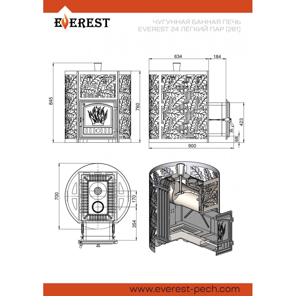 Банные печи Эверест Лёгкий Пар из жаропрочного чугуна отличает наличие закрытой каменки, выполненной из экологичной, экономичной нержавеющей стали марки AISI 430. Такое дополнение в обновленном ряду Эверест позволяет получить от печей серии Лёгкий Пар любую требуемую разновидность пара. Капельная подача воды, через специальную систему в закрытую каменку, позволяет получить качественный перегретый мелкодисперсный пар в нужных количествах, не боясь залива каменки. При этом лучшие характеристики линейки печей Эверест из жаропрочного чугуна остались на высоком уровне: заводской чугун оптимальной толщины; большая теплоёмкость; значительная мощность печи; простая для установки конструкция.
