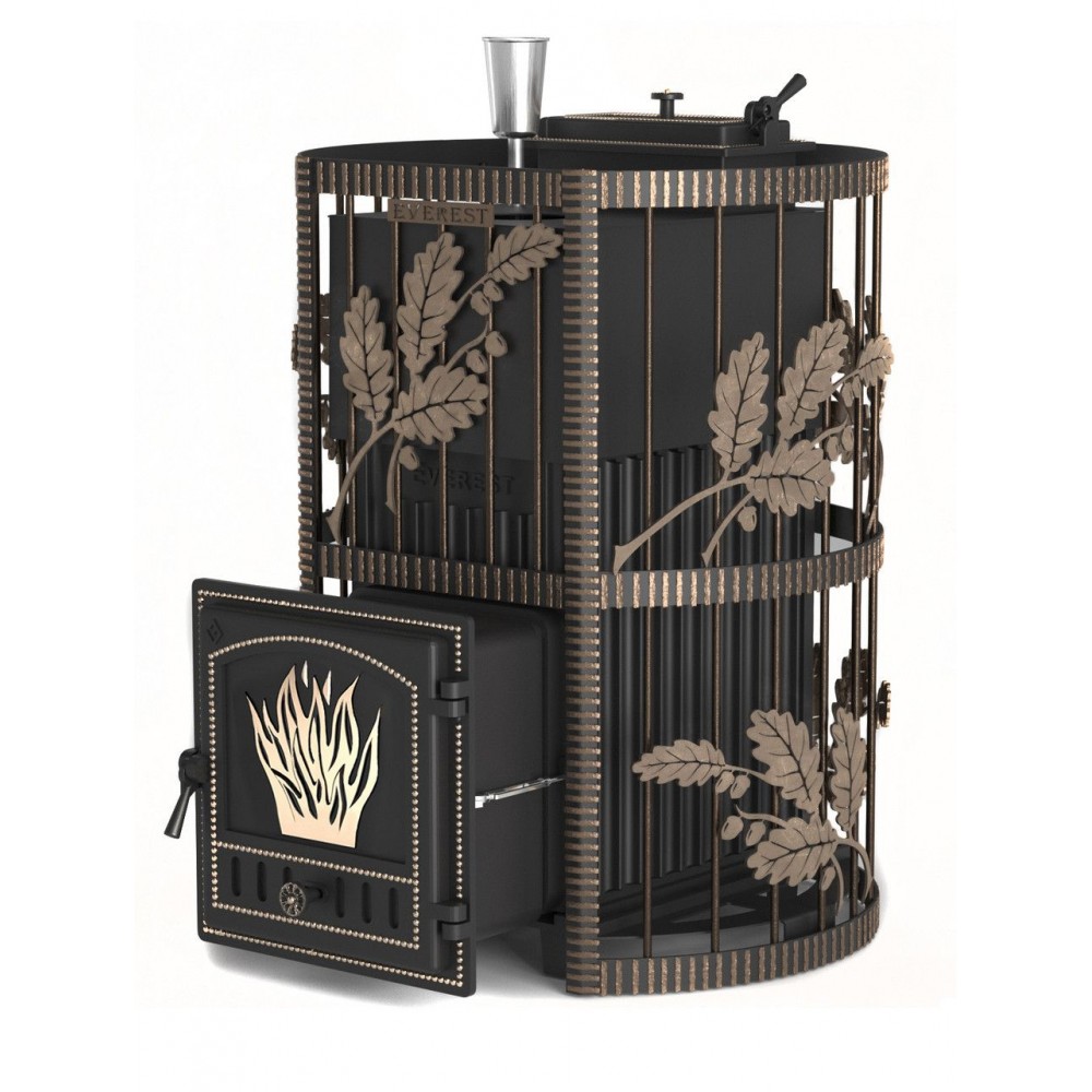 Чугунная банная печь Эверест 24 в кованной сетке с закрытой каменкой.