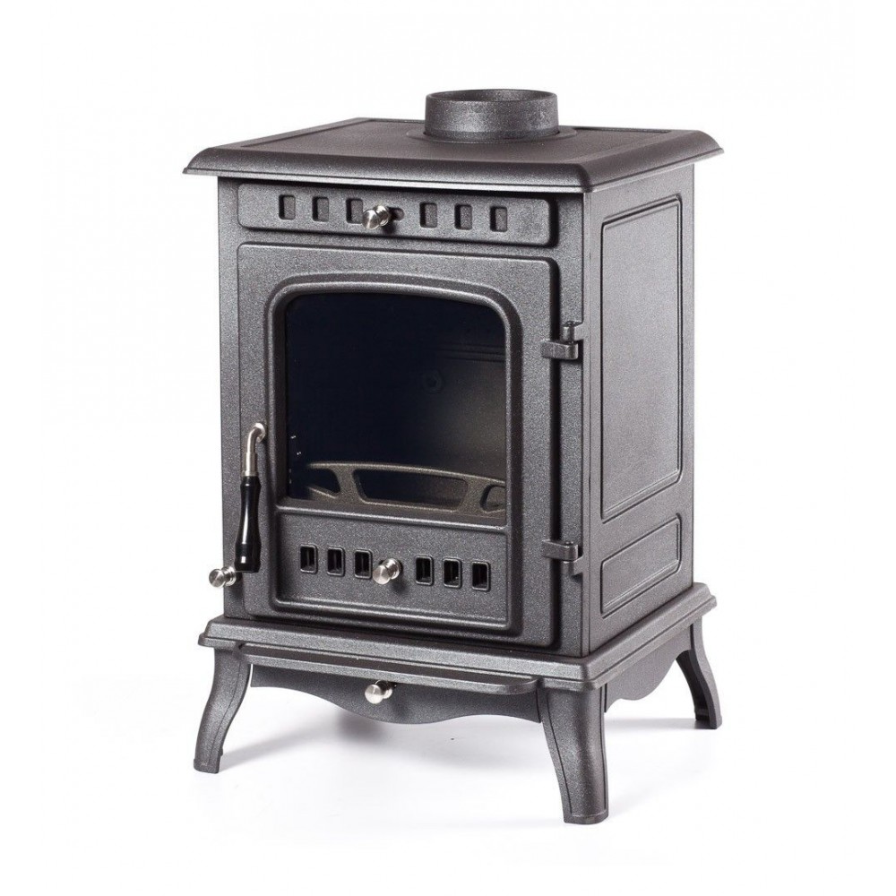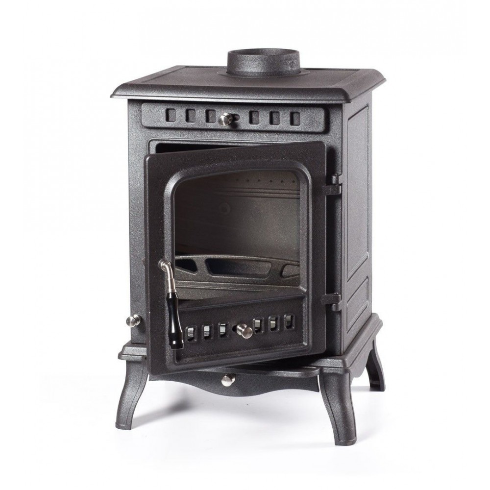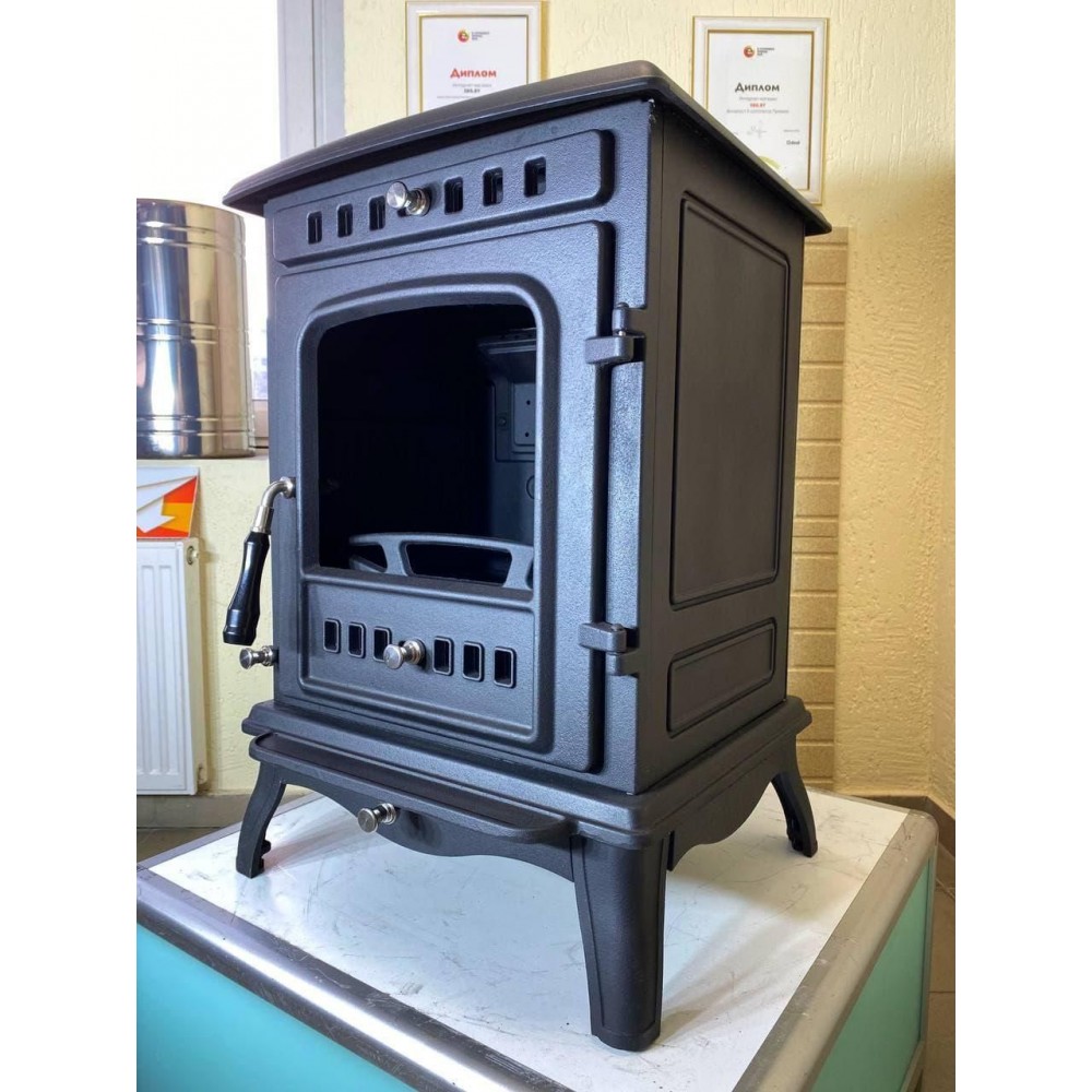 Максимальная тепловая мощность печи 10 кВт. КПД 79%. Систем длительного горения, работа в режиме тления до 8 часов. Система обдува стекла. Загрузка дров фронтальная. Диаметр дымохода 140 мм. Расположение дымохода сверху и сзади. Отделка антрацит. Размер стекла 251х270х4 mm.