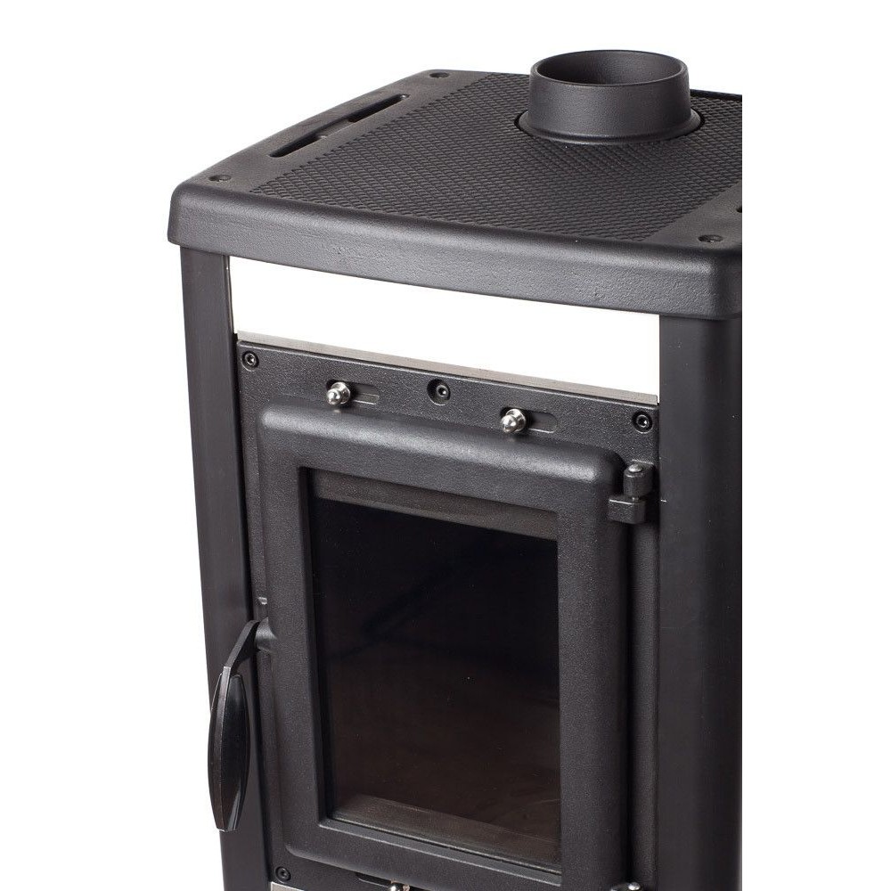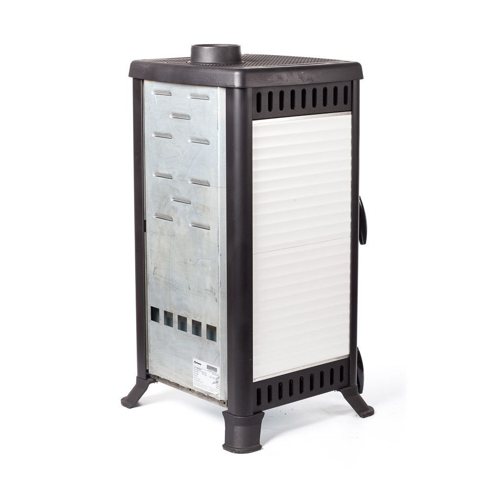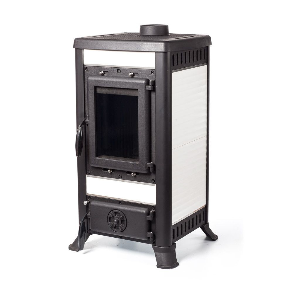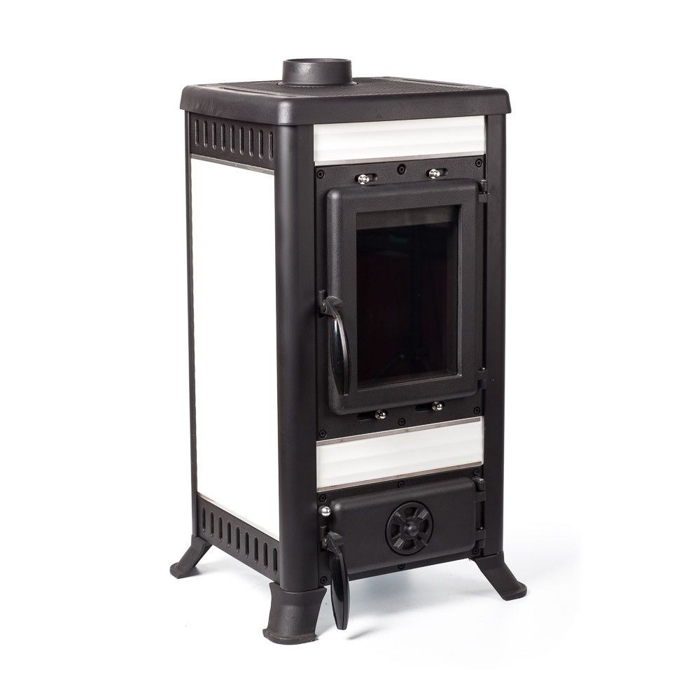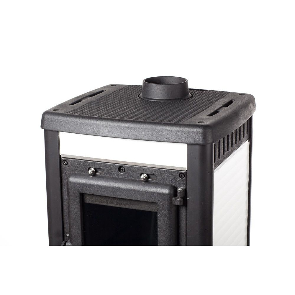 Тепловая мощность печи 8 кВт. КПД 75%. Систем длительного горения, работа в режиме тления до 8 часов. Система обдува стекла. Система дистанционного сброса золы с колосника. Загрузка дров фронтальная. Диаметр дымохода 120 мм. Расположение дымохода сверху. Отделка антрацит с керамическими вставками белого цвета. Размер стекла 313х221х4 mm.