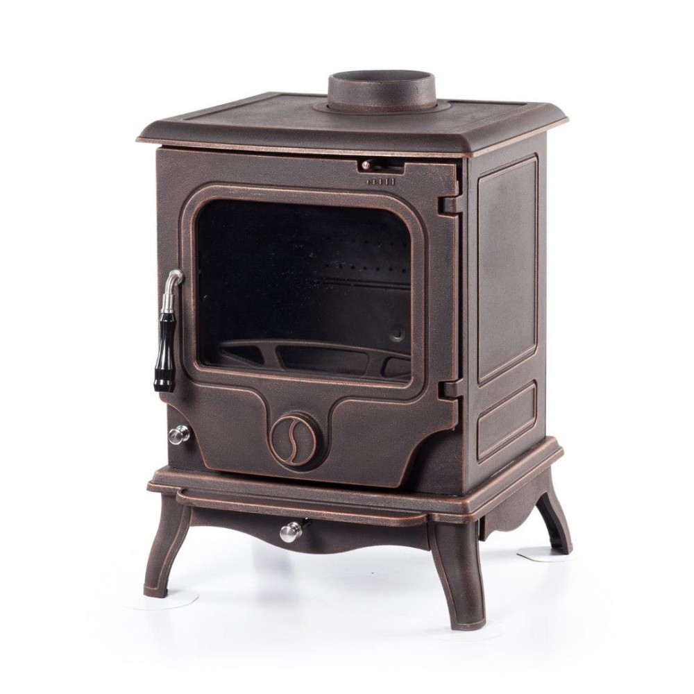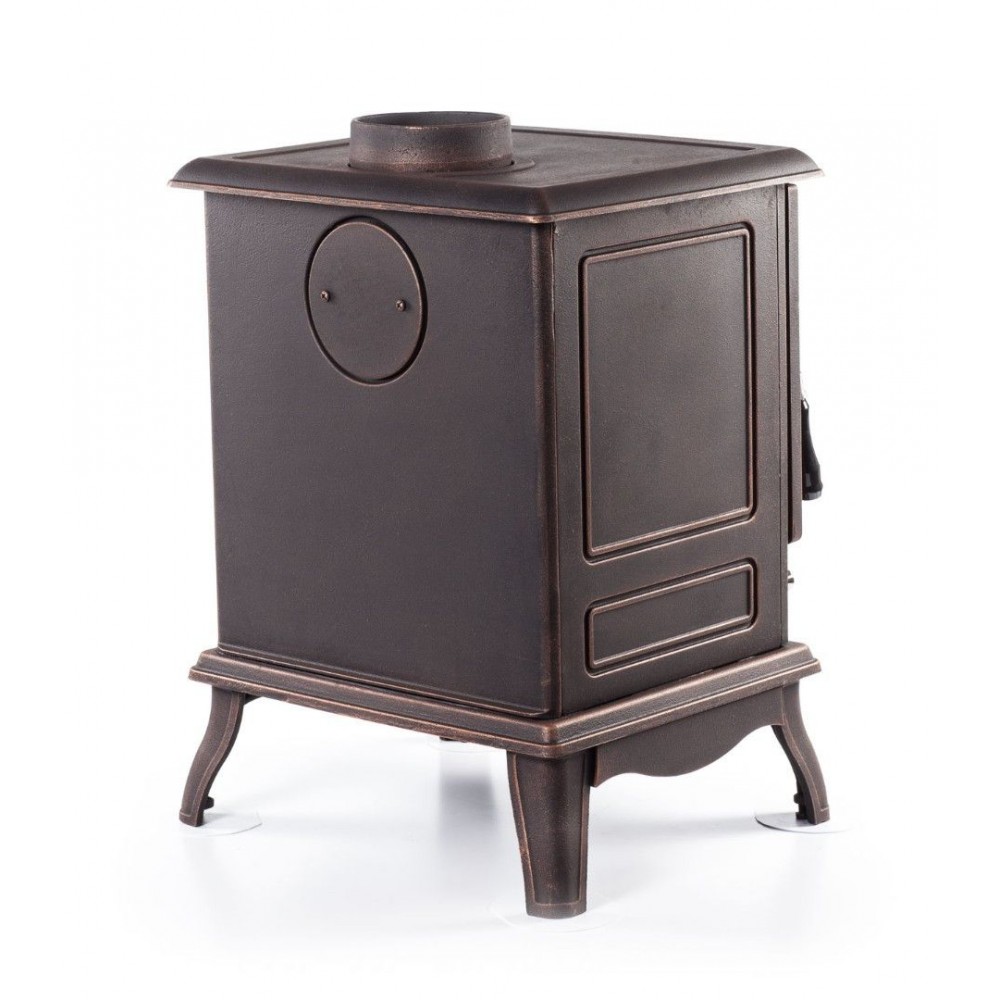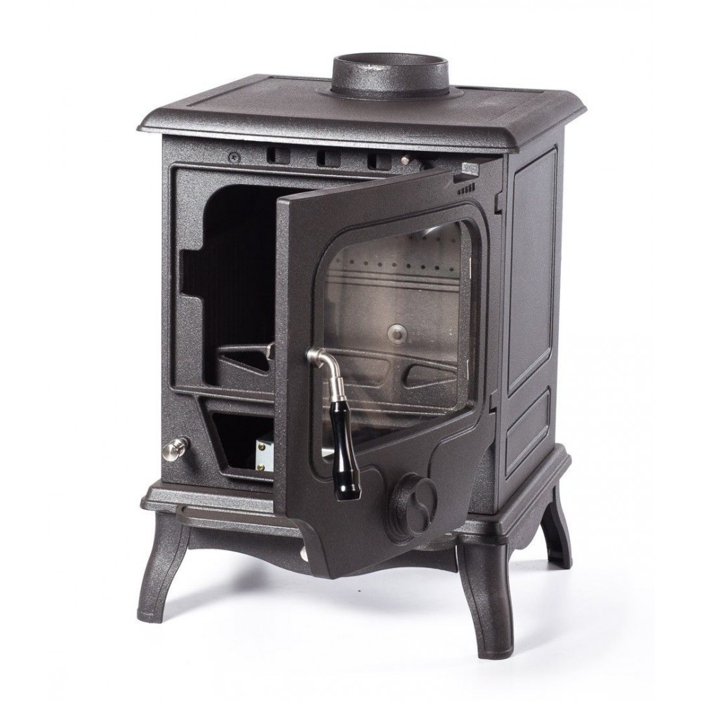 Максимальная тепловая мощность печи 10 кВт. КПД 79%. Систем длительного горения, работа в режиме тления до 8 часов. Система обдува стекла. Загрузка дров фронтальная. Диаметр дымохода 140 мм. Расположение дымохода сверху и сзади. Отделка антрацит. Размер стекла 251х270х4 mm.