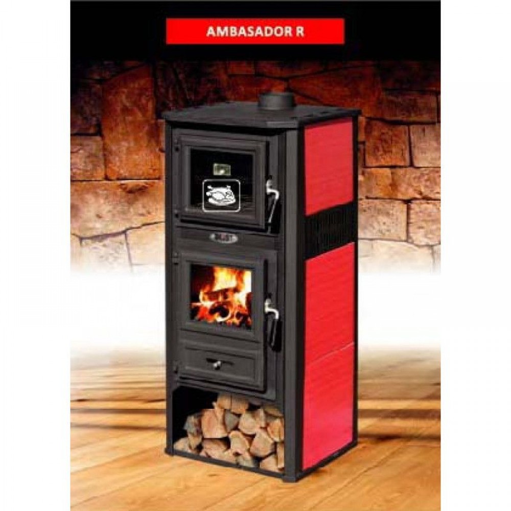 Печь-камин Blist Ambasador R помимо функции обогрева с внушительным диапазоном мощности 10 - 12.1 кВт оснащена духовым шкафом для приготовления пищи. Печь изготовлена из стали, а дверца топки и духовки, а также верхняя плита - из чугуна. Топочная камера выложена шамотом.