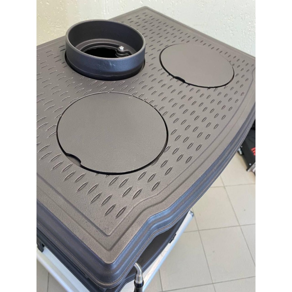 Максимальная тепловая мощность печи 10 кВт. КПД 79%. Варочная плита с двумя конфорками. Систем длительного горения, работа в режиме тления до 8 часов. Система обдува стекла. Загрузка дров фронтальная. Диаметр дымохода 150 мм. Расположение дымохода сверху и сзади. Отделка антрацит. Размер фронтального стекла 380х315х4 mm. Размер упаковки ДхШхВ: 650х540х930 mm. Гарантия 5 лет.