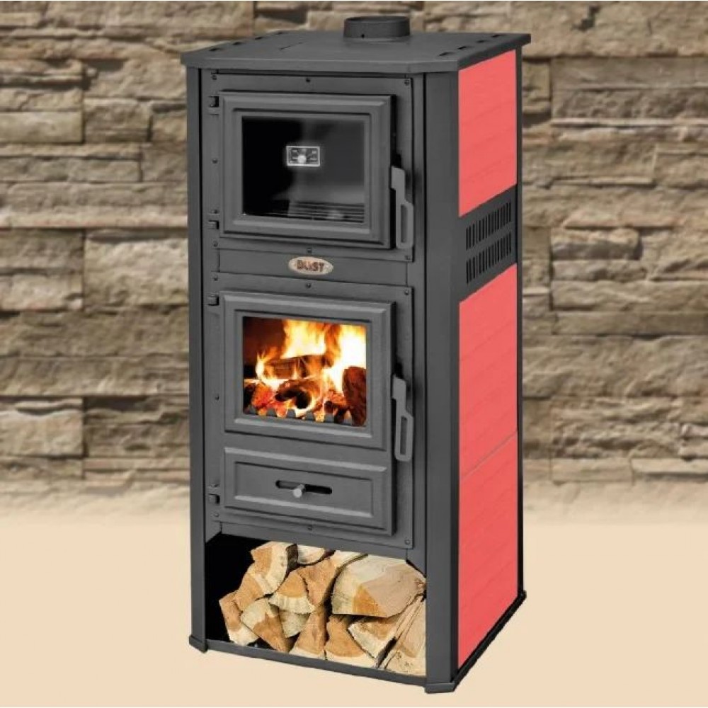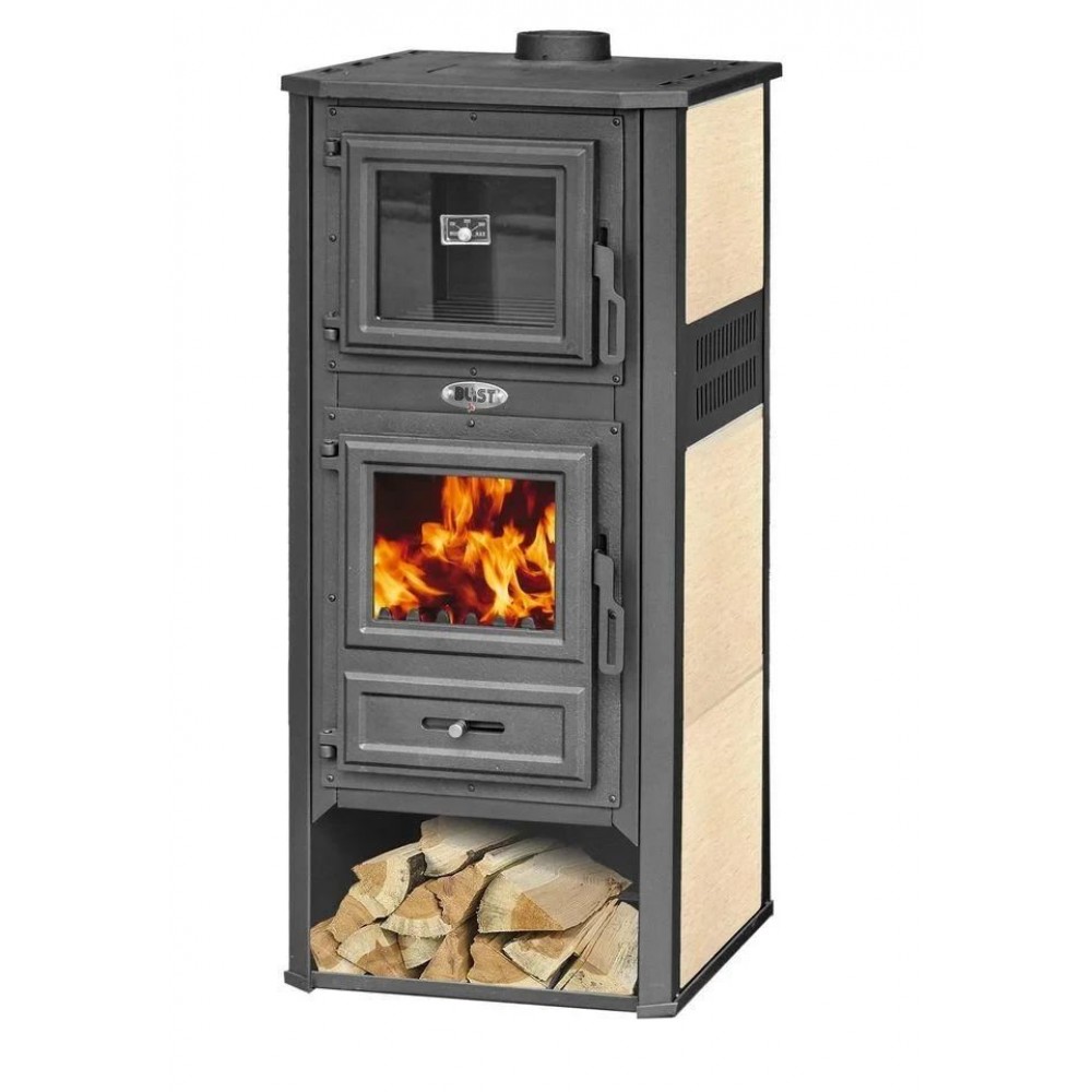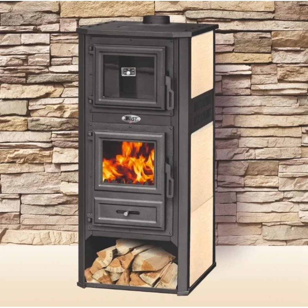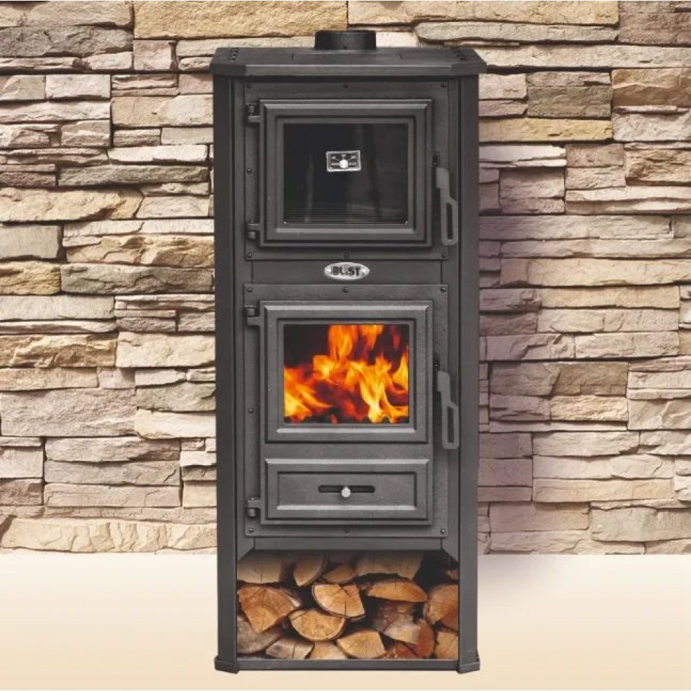 Печь-камин Blist Ambasador R помимо функции обогрева с внушительным диапазоном мощности 10 - 12.1 кВт оснащена духовым шкафом для приготовления пищи. Печь изготовлена из стали,а дверца топки и духовки, а также верхняя плита - из чугуна. Топочная камера выложена шамотом.